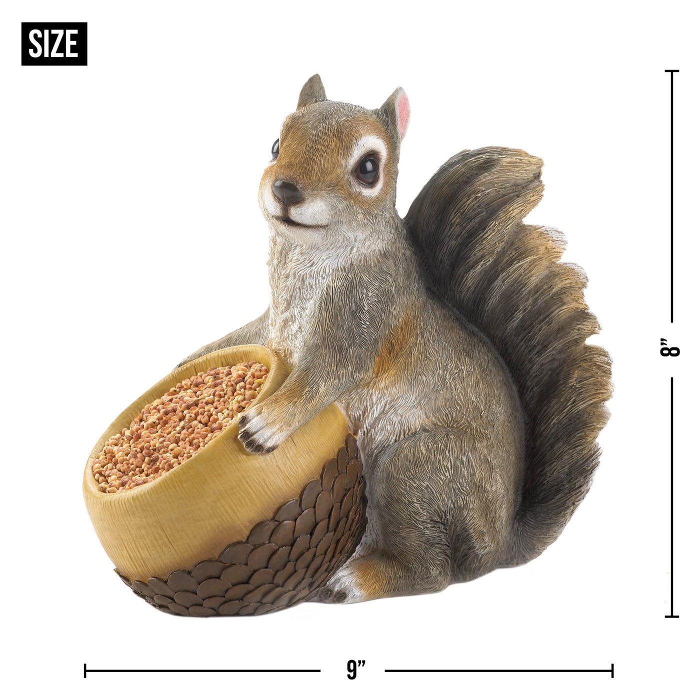 • Feed your outdoor feathered friends with this squirrel and acorn bird feeder. Place in your garden or a flower pot to invite more winged visitors to your yard and make it their springtime home.