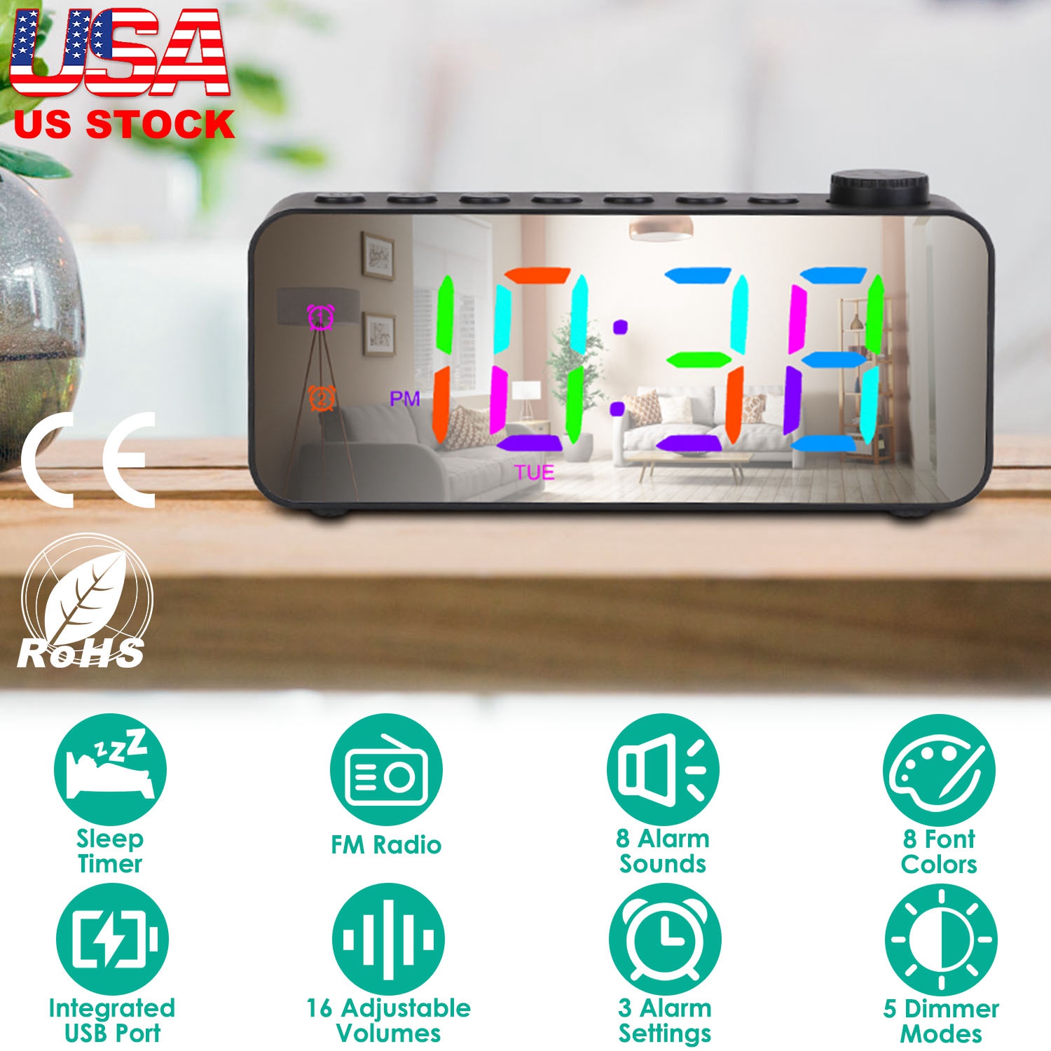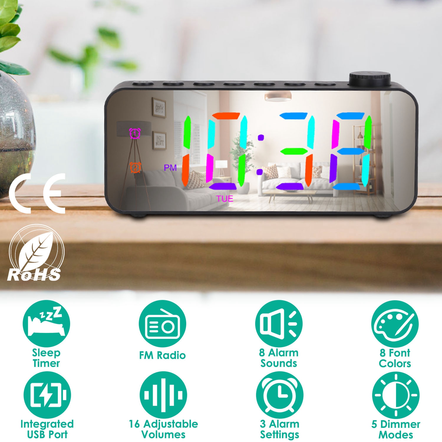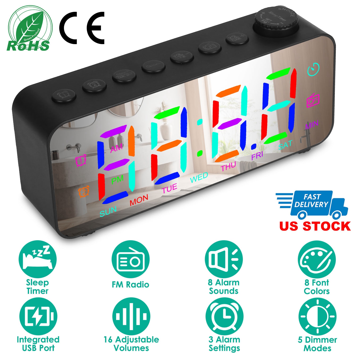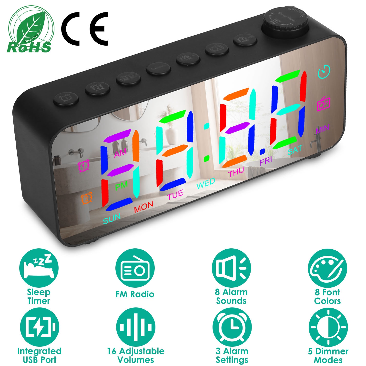 RGB Color LED Digital Alarm Clock Electric Alarm Clock with 8 Alarm Sounds 8 Font Colors 16 Adjustable Volumes 5 Dimmer Modes 3 Alarm Settings Mirror