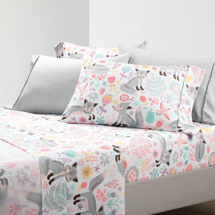 Full size Pink Grey White Teal Floral Fox Birds Soft Polyester 6 Piece Sheet Set