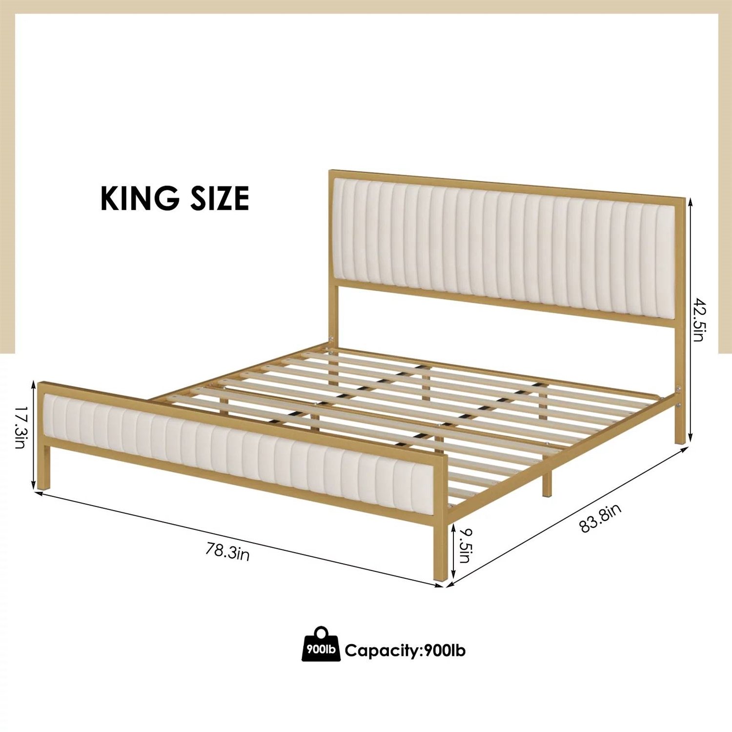 King size Gold Metal Platform Bed Frame with Beige White Upholstered Headboard