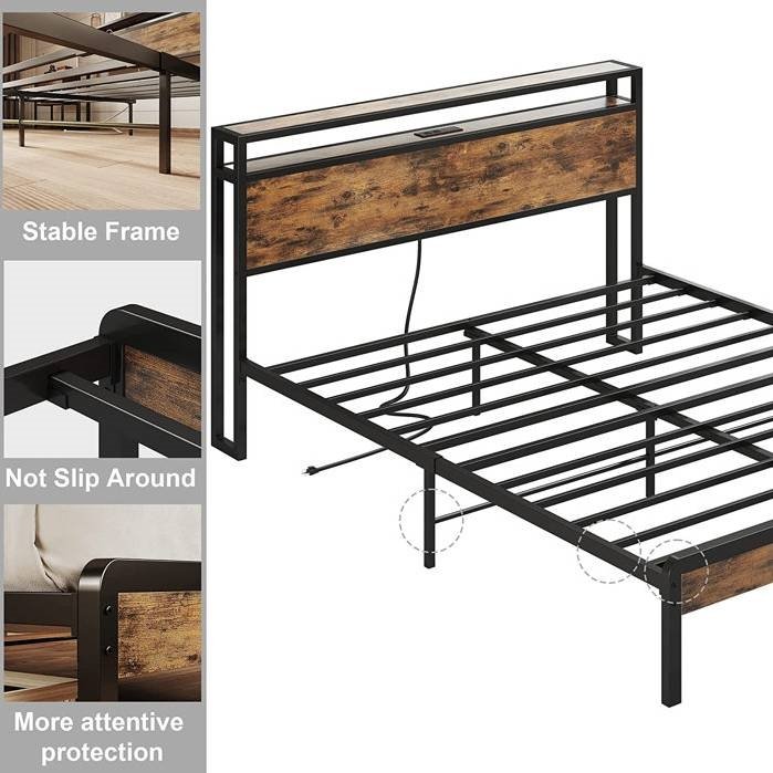 King Size Industrial Platform Bed Frame with Storage Headboard and Power Outlets