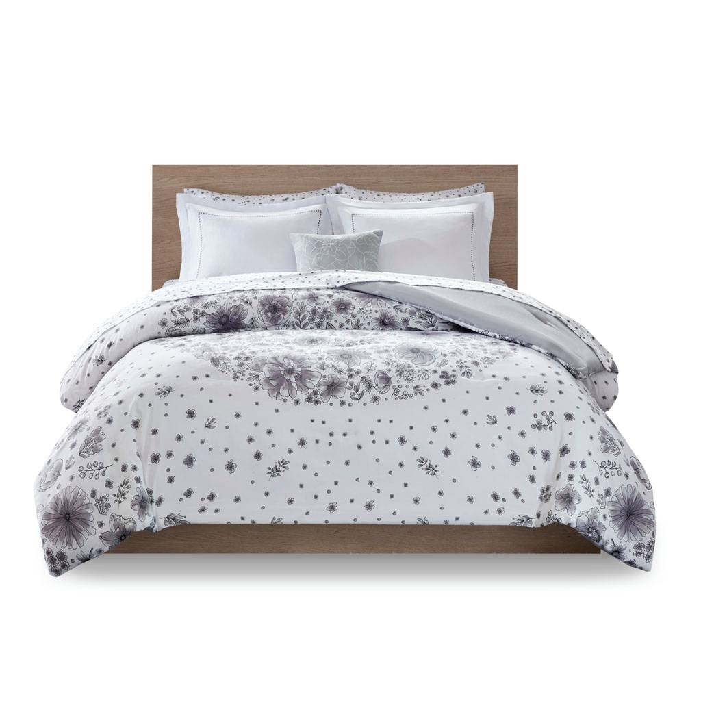 Twin size 6-piece White Grey Floral Pattern Microfiber Comforter Set
