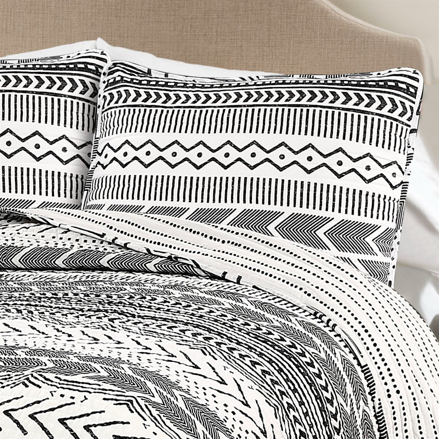 King 3 Piece Scandinavian Style Chevron Black White Reversible Cotton Quilt Set