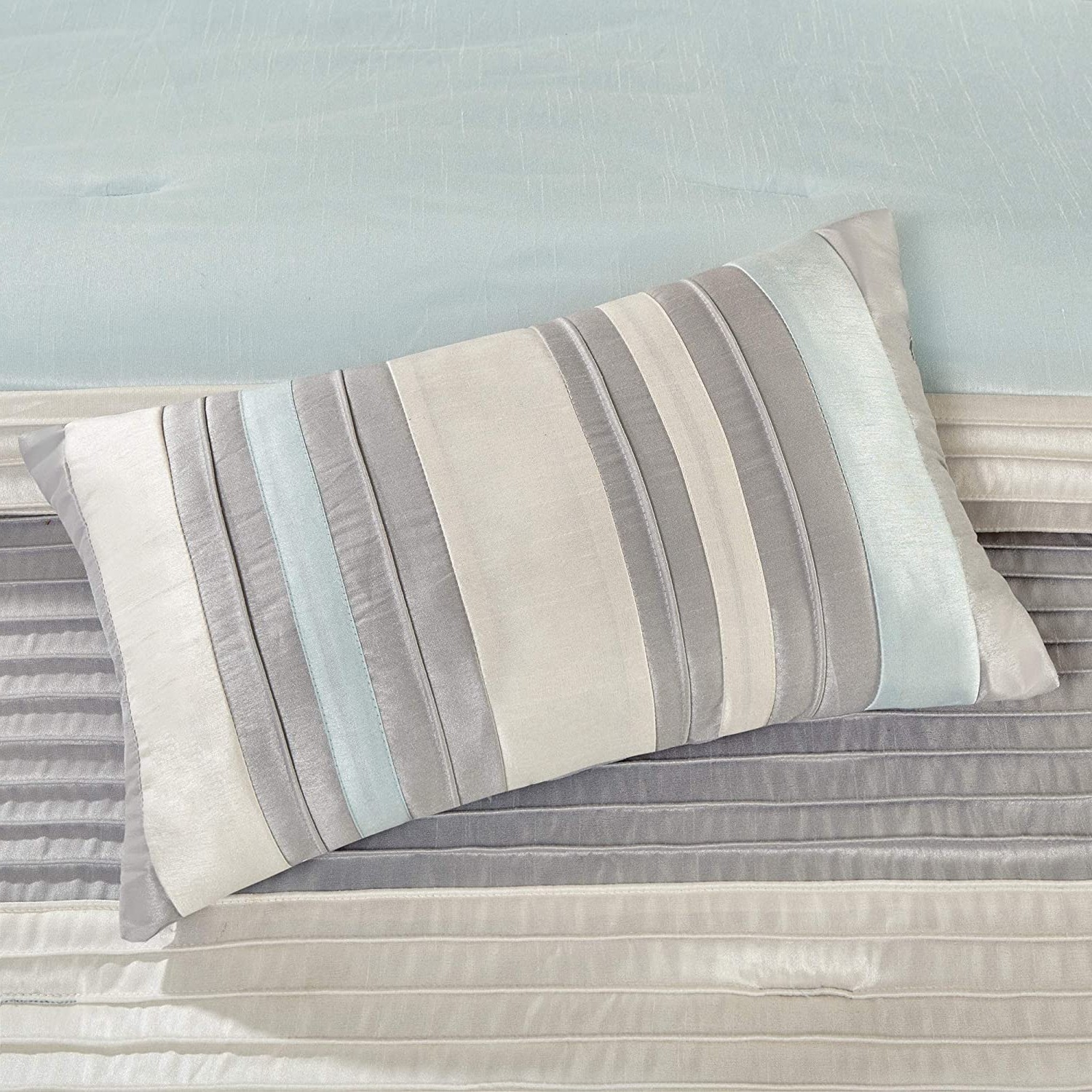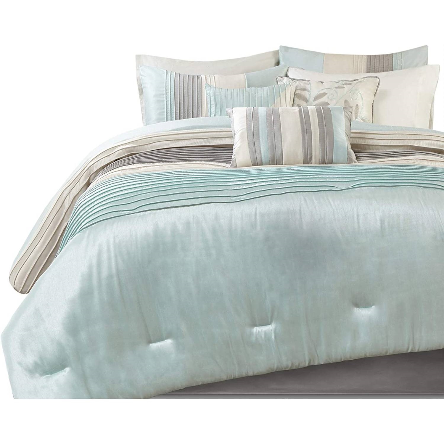 Queen Size 7 Piece Bed In A Bag Comforter Set Faux Silk Blue Stripes